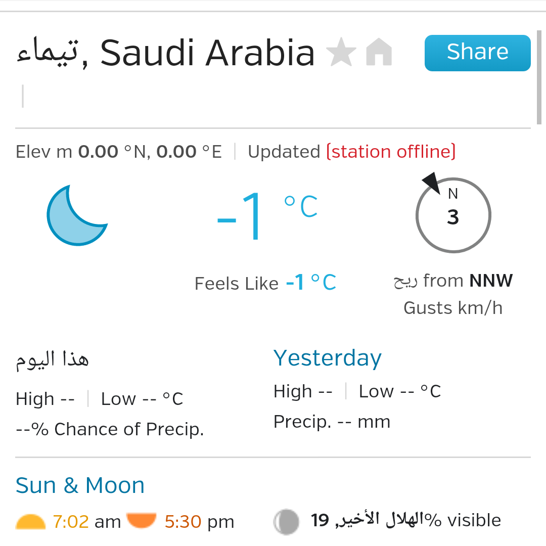 معاذ الخلف Na Twitteru الطقس في تيماء الان لازالت درجات الحرارة منخفضة جدا تسجل 2 م وارتفاع الرطوبة مع ارتفاع الدرجة المحسوسة 8 م Https T Co Anamo21osn
