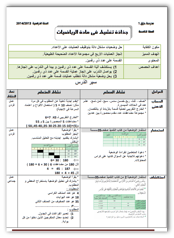 جذاذة تنشيط حصة في الرياضيات س5 القسمة على عدد ذي رقمين موارد المعلم