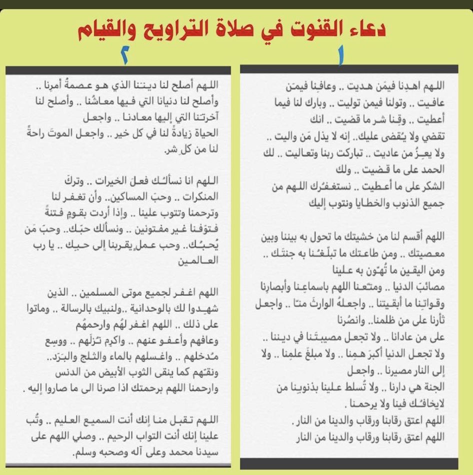 دعاء القنوت في التراويح. يعمل المسلمين على اداء صلاة التراويح بالشكل اليومي وذالك بعد صلاة العشاء في كل ليلة من ليالي شهر رمضان المبارك وايضا يعمل الدعاء على الدعاء الى الله عز وجل وذالك في نهاية صلاة. دعاء القنوت في الوتر 14093 تاريخ النشر. دعاء صلاة التراويح مختصر ادعية صلاة التراويح مكتوبة اللهم اهدنا في من هديت وعافنا في من عافيت و تولنا في من توليت و بارك لنا في ما اعطيت. الوتر التأمين خلف الإمام في القنوت في الوتر.