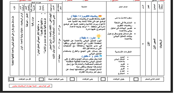 دفتر تحضير الرياضيات للصف الاول الابتدائي 2021