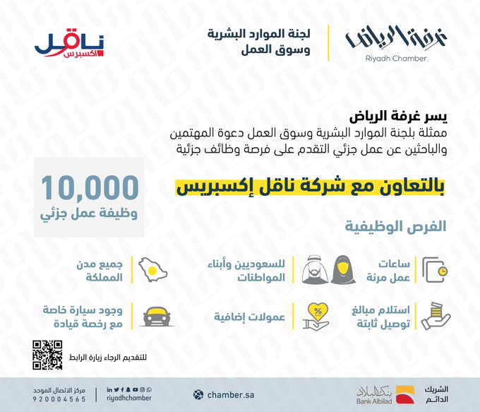 وظائف للسعوديين No Twitter 10 000 وظيفة عمل جزئي تعلن غرفة الرياض عن وظائف فى شركة ناقل اكسبريس للسعوديين و ابناء المواطنات رجال و نساء بجميع مدن المملكة يشترط سيارة