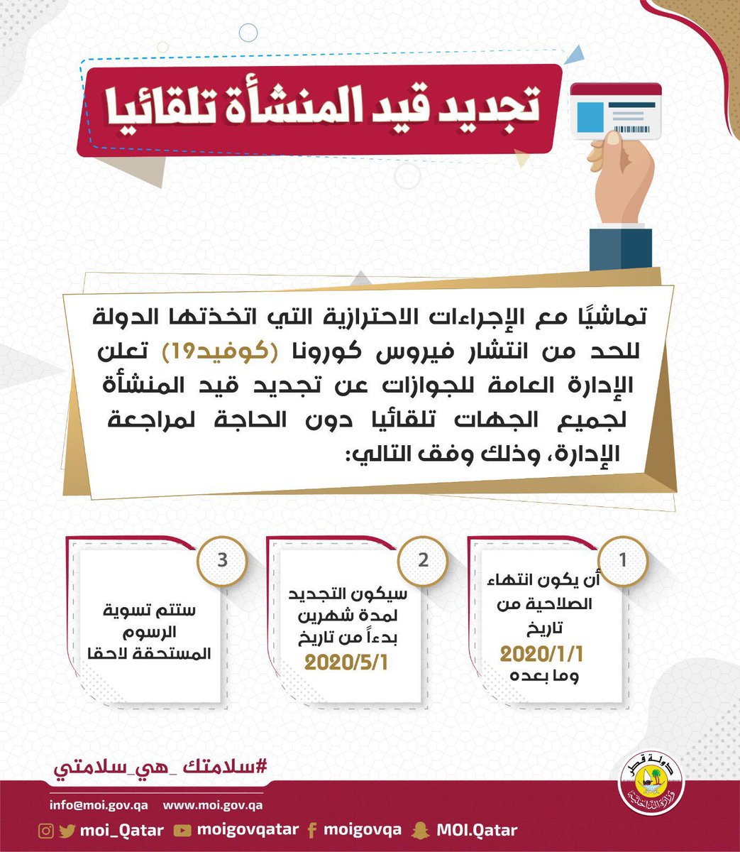 وزارة الداخلية قطر בטוויטר تماشي ا مع الإجراءات الاحترازية التي اتخذتها الدولة للحد من فيروس كورونا تعلن الإدارة العامة للجوازات عن تجديد قيد المنشأة المنتهية صلاحيته تلقائيا لجميع الجهات دون الحاجة لمراجعة الإدارة الداخلية قطر رمضان