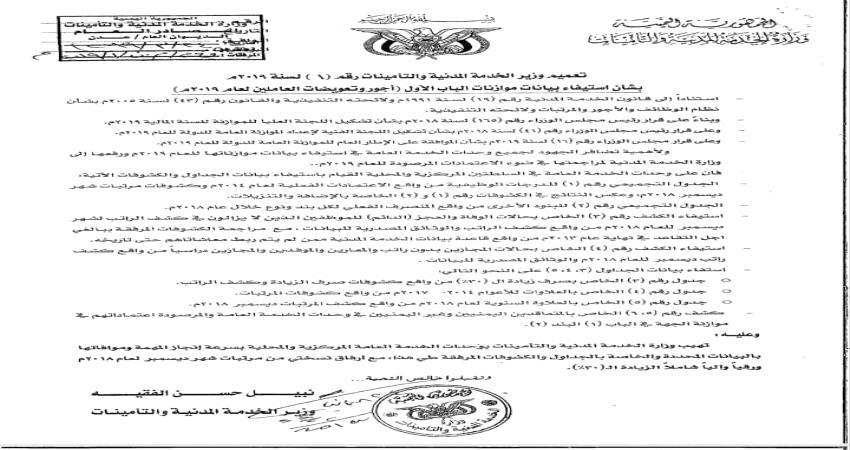 اخبار عدن تعميم صادر عن وزارة الخدمة المدنية بشان استيفاء بيانات اجور وتعويضات العاملين