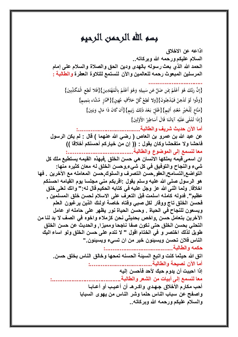 اذاعة مدرسية عن حسن الخلق و الاخلاق الحميدة ملزمتي