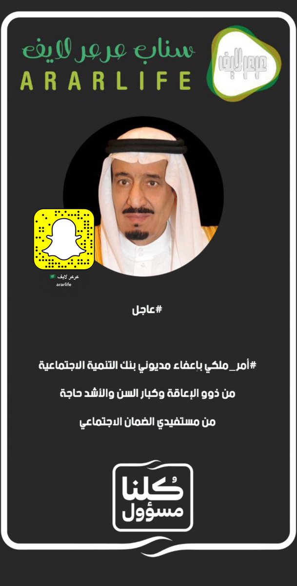 O Xrhsths عـ ر عـ ر لـ ا يـ ف Sto Twitter صدور موافقة خادم الحرمين الشريفين بإعفاء عدد من المواطنين المقترضين من بنك التنمية الاجتماعية وهم الفئات الأشد حاجة من مستفيدي