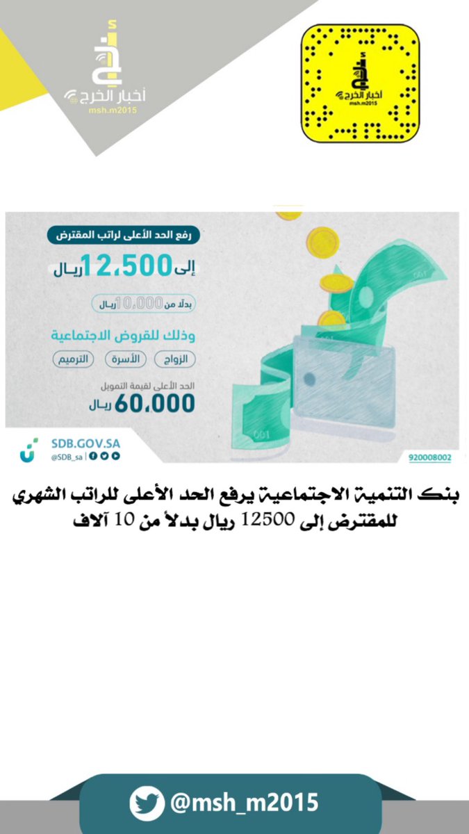 سناب اخبار الخرج On Twitter بنك التنمية الاجتماعية يرفع الحد الأعلى للراتب الشهري للمقترض إلى 12500 ريال بدلا من 10 آلاف الخرج
