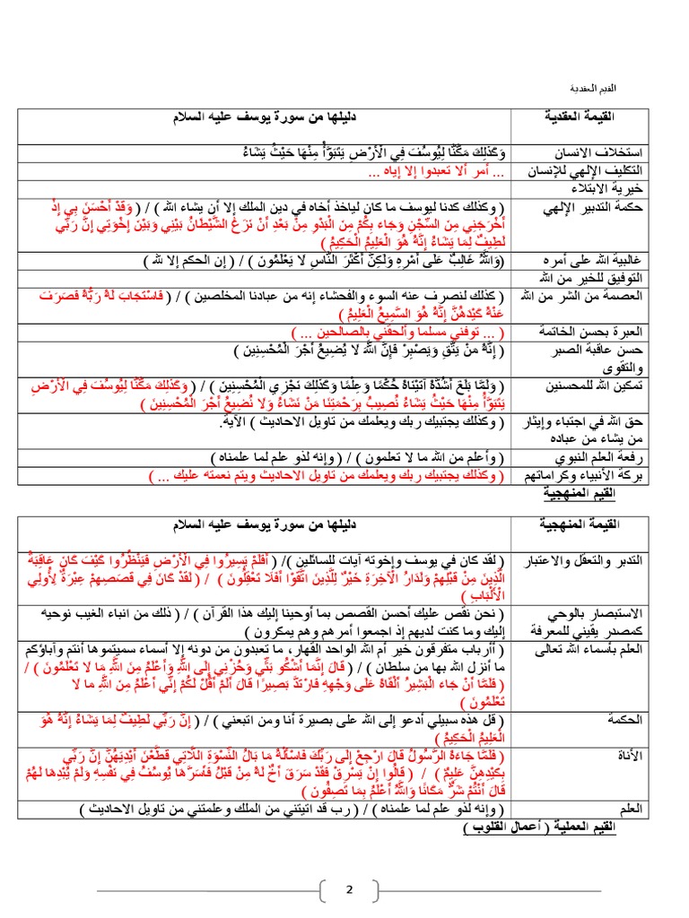القيم الواردة والمستفادة من سورة يوسف أولى باك Pdf المنير