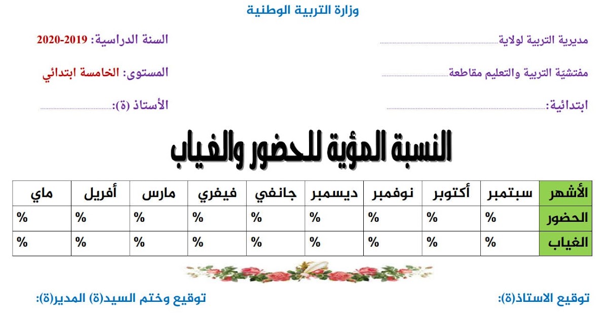 النسبة المئوية للحضور والغياب الشهري للسنة الخامسة 5 ابتدائي 2019 2020 مدونة حلمنا العربي