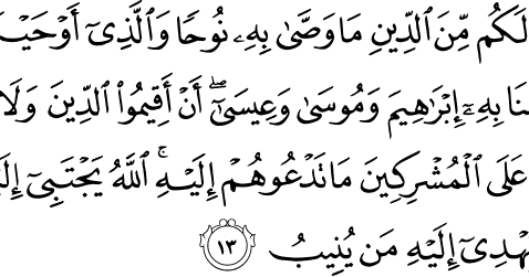 ش ر ع ل ك م م ن الد ين م ا و ص ى ب ه ن وح ا و ال ذ ي أ و ح ي ن ا إ ل ي ك و م ا و ص ي ن ا ب ه إ ب ر اه يم و م وس ى و ع يس ى أ ن أ ق يم وا الد ين و ل ا ت ت ف ر ق وا ف يه ك ب ر ع ل ى ال م ش ر ك ين م ا ت د ع وه م إ ل ي ه الل ه