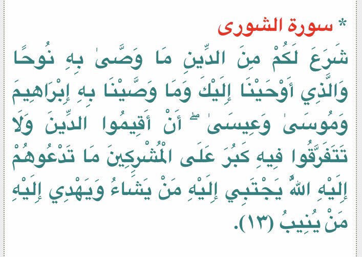 عبد الله ابن خزي م سبيع الغلباء V Twitter شرع لكم من الدين ما وصى به نوحا والذي أوحينا إليك وما وصينا به إبراهيم وموسى وعيسى أن أقيموا الدين ولاتتفرقوا فيه