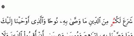 ش ر ع ل ك م م ن الد ين م ا و ص ى ب ه ن وح ا و ال ذ ي أ و ح ي ن ا إ ل ي ك و م ا و ص ي ن ا ب ه إ ب ر اه يم و م وس ى و ع يس ى أ ن أ ق يم وا الد ين و ل ا ت ت ف ر ق وا ف يه ك ب ر ع ل ى ال م ش ر ك ين م ا ت د ع وه م إ ل ي ه الل ه