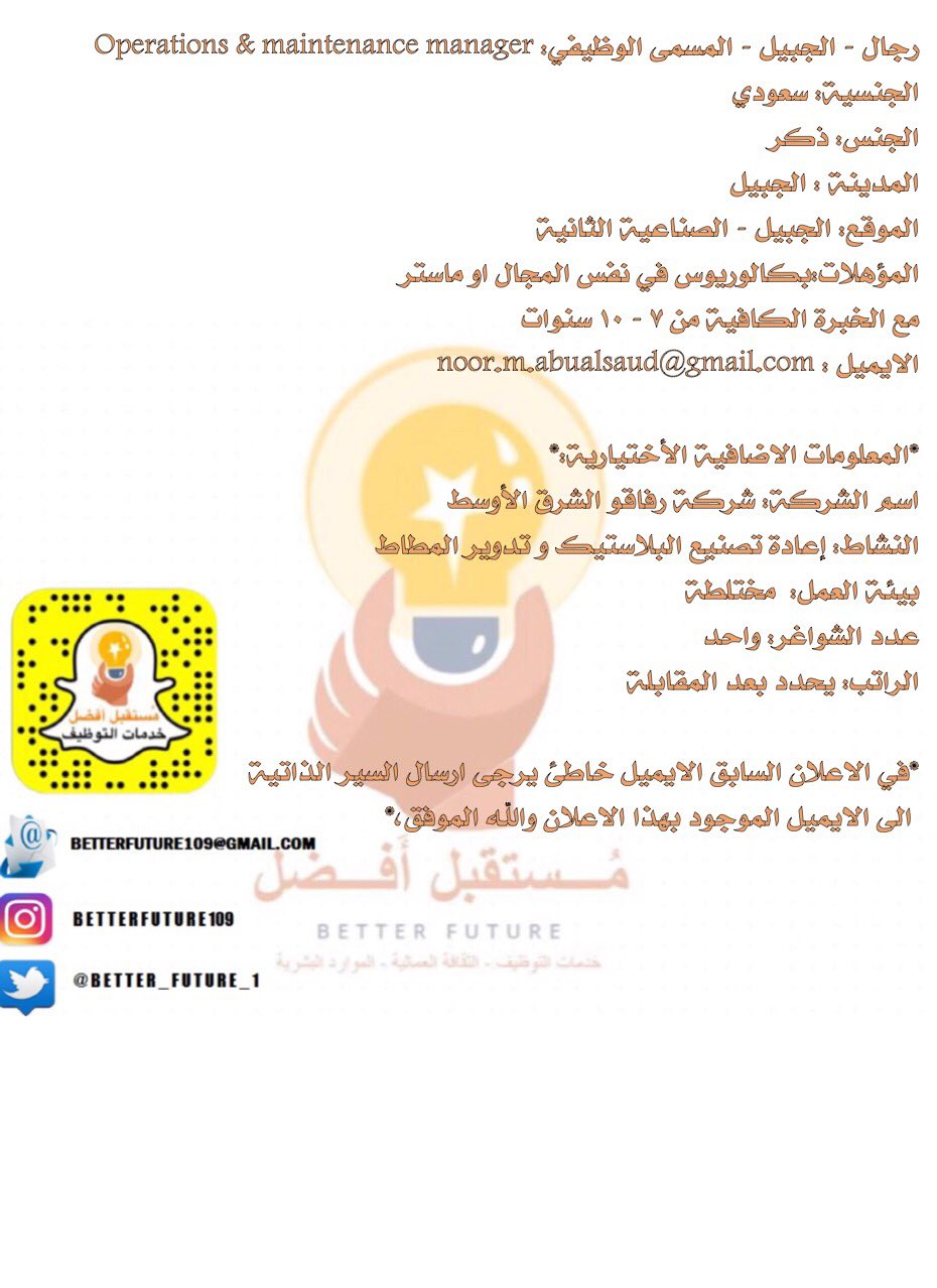 م ستقبل أ فضل Betterfuture No Twitter رجال الجبيل مطلوب لدى شركة رفاقو الشرط الاوسط وظيفة بالتقاصيل بالصورة ادناه وظائف الجبيل