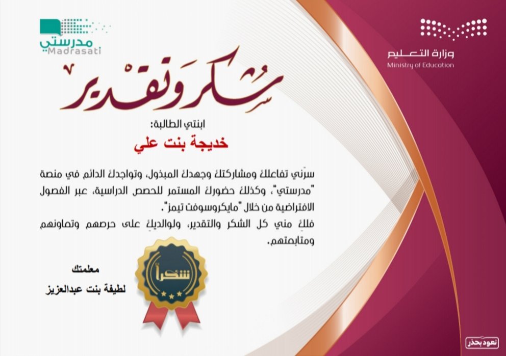 شهادات شكر وتقدير منصة مدرستي فهرس